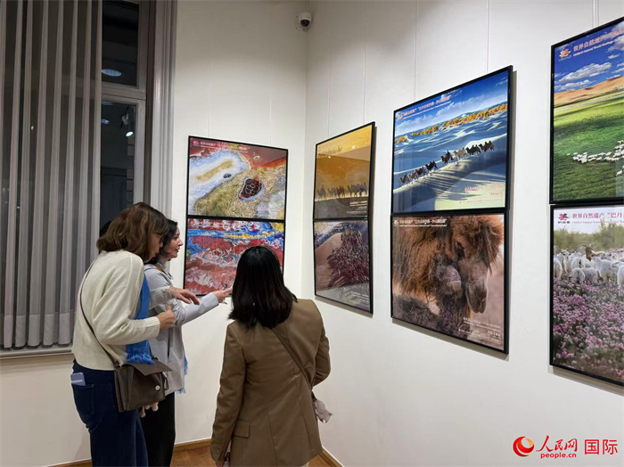 布魯塞爾的秋日午后,馬頭琴曲《天邊》的悠揚(yáng)旋律在文化中心大廳回蕩,與展廳內(nèi)的影像畫(huà)面交相輝映。渾厚悠長(zhǎng)的《蒼天般的阿拉善》樂(lè)聲,映襯著巴丹吉林沙漠的全景圖片,令人仿佛置身大漠深處。提前到場(chǎng)的嘉賓們饒有興致地翻閱文旅手冊(cè)與遺產(chǎn)保護(hù)資料,對(duì)這片來(lái)自中國(guó)北疆的神奇土地充滿(mǎn)好奇與期待。