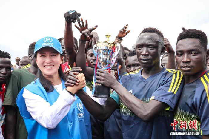 當(dāng)?shù)貢r(shí)間2025年9月23日,聯(lián)合國難民署親善大使楊揚(yáng)訪問位于埃塞俄比亞的班巴西難民營,與難民及當(dāng)?shù)厣鐓^(qū)足球友誼賽獲勝團(tuán)隊(duì)共同舉起獎(jiǎng)杯。(聯(lián)合國難民署供圖)