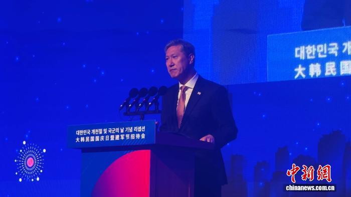 11月6日,韓國(guó)駐華大使盧載憲在招待會(huì)上致辭?!≈行戮W(wǎng)記者 蘇婧欣 攝