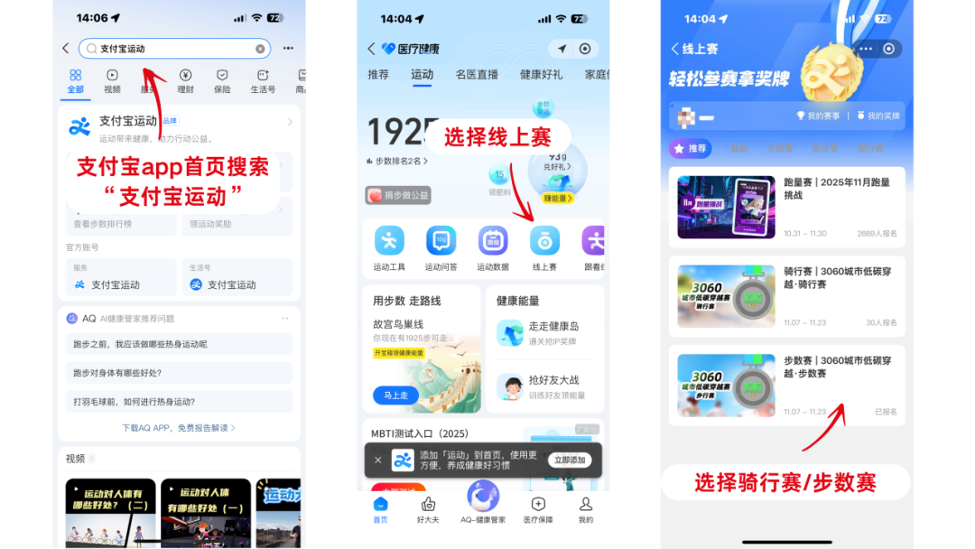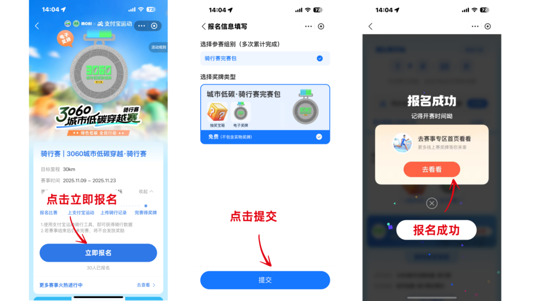 通過(guò)支付寶APP,搜索“支付寶運(yùn)動(dòng)”小程序進(jìn)入“線上賽”專區(qū)報(bào)名參賽,或搜索“3060城市低碳穿越賽”小程序輪播頁(yè)跳轉(zhuǎn)報(bào)名。