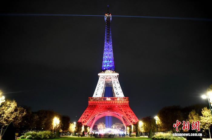 當(dāng)?shù)貢r(shí)間11月12日晚,巴黎埃菲爾鐵塔點(diǎn)亮象征法國的亮紅、白、藍(lán)燈光,悼念十年前巴黎系列恐怖襲擊的遇難者,表達(dá)國家團(tuán)結(jié)?!≈行律缬浾?李洋 攝