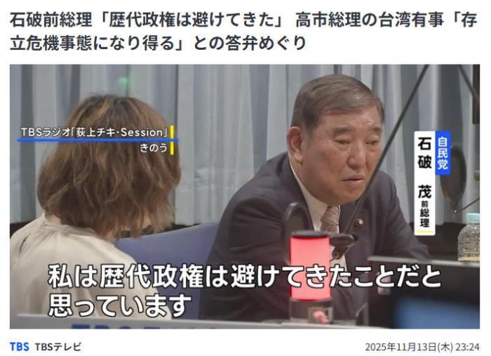 11月13日,日本前首相石破茂在TBS電臺節(jié)目中,對高市的言論表示反對。