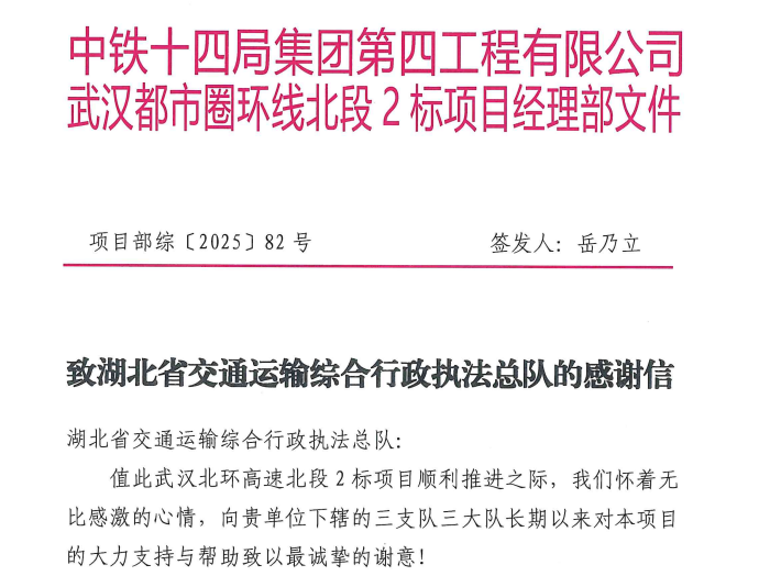 近日,湖北省交通運輸綜合行政執(zhí)法總隊收到一封來自中鐵十四局集團第四工程有限公司的感謝信。信中,武漢都市圈環(huán)線北段2標項目部特意致謝總隊高速公路路政執(zhí)法三支隊三大隊,稱贊其在項目施工審批、現(xiàn)場協(xié)調(diào)、交通疏導等關(guān)鍵環(huán)節(jié)的“全鏈條”靠前服務,以專業(yè)高效的舉措為工程推進掃清障礙,讓企業(yè)切實感受到服務速度與溫度。