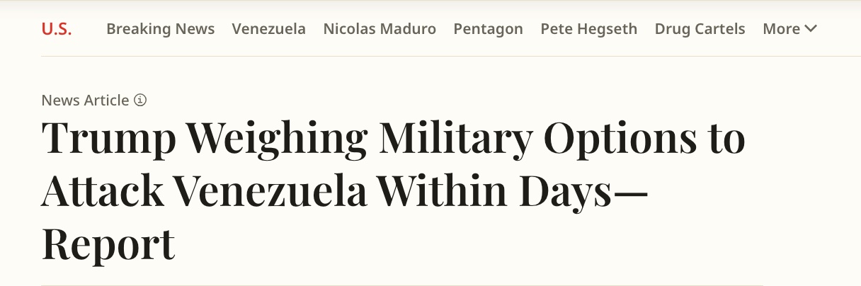 △美國《新聞周刊》報道,特朗普正在權(quán)衡于數(shù)日內(nèi)對委內(nèi)瑞拉發(fā)起軍事打擊。