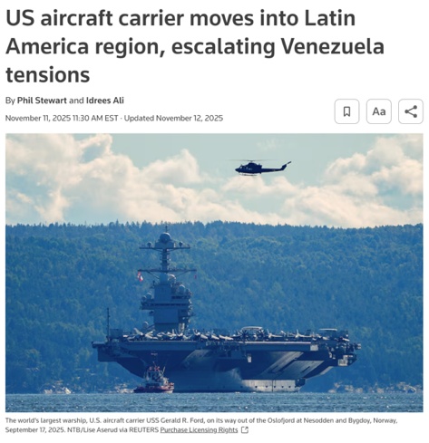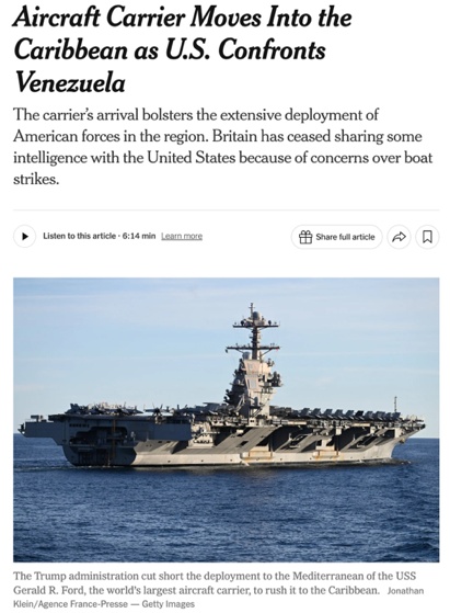△《紐約時報》報道,美國最先進的“福特”號航母日前進入加勒比海區(qū)域,美國政府正在考慮采取進一步軍事行動,旨在推翻馬杜羅政權(quán)。