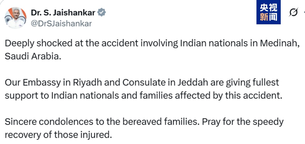 蘇杰生發(fā)表聲明稱,對在麥地那發(fā)生的涉及印度公民的事故深感震驚,并稱印度駐利雅得大使館和駐吉達領(lǐng)事館正在全力支持受此次事故影響的印度公民及其家屬。(總臺記者 張玥 張亞寧)