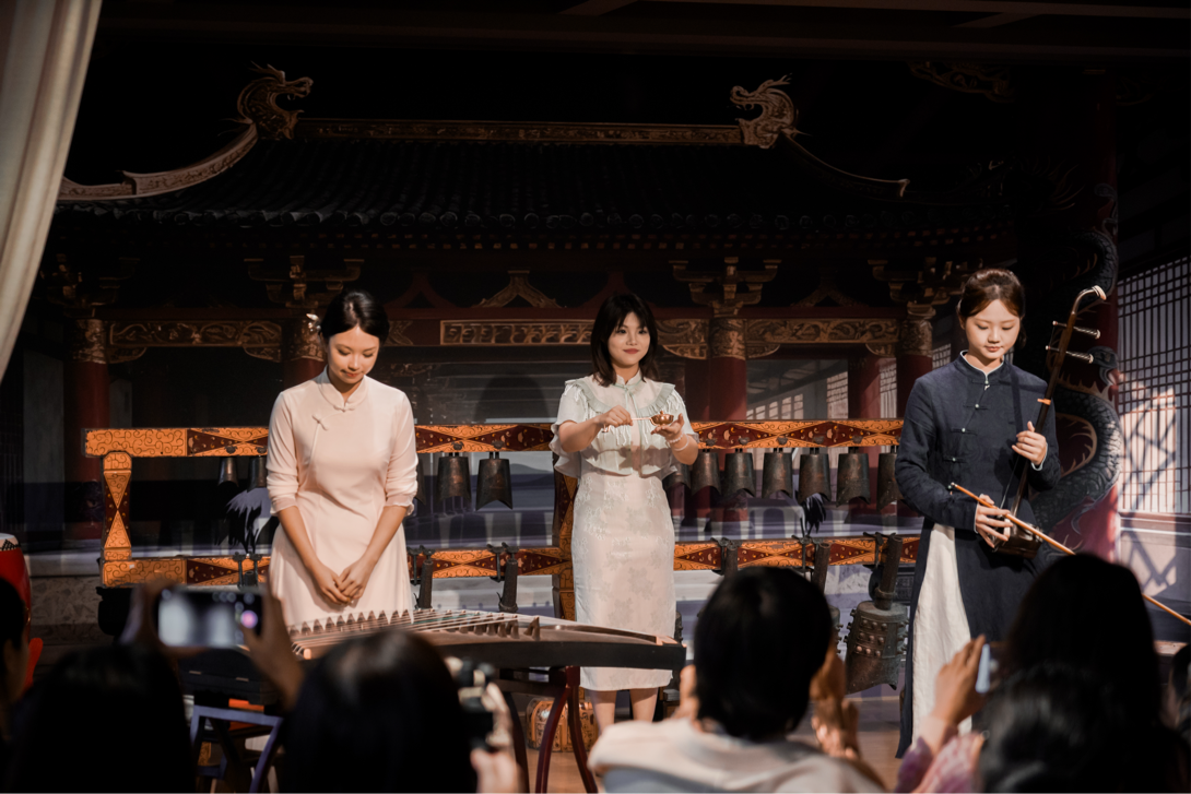 在荊州博物館的場域里,湖北第二師范學(xué)院美育團(tuán)隊帶來的“文人雅韻”篇章,更落地了“人人美育,美育人人,美育浸潤,培根鑄魂”的理念:一方面,書法的枯潤濃淡與樂器技法呼應(yīng)——《寒食帖》里二胡長音摹寫“破灶”筆觸,《松風(fēng)閣》中琵琶輪拂復(fù)刻松濤筆勢;另一方面,荊州博物館助力還原的宋代“嬰香”(依《陳氏香譜》復(fù)原)、編鐘紋飾拓片、三帖高仿復(fù)本,讓觀眾在“視聽嗅觸”中觸摸文物與書法的溫度,文物不再是玻璃后的靜物,而是美育的鮮活教材,更是文博資源與美育理念的共生,在文博與藝術(shù)的碰撞里讓荊楚文化的“根”,扎得更深。