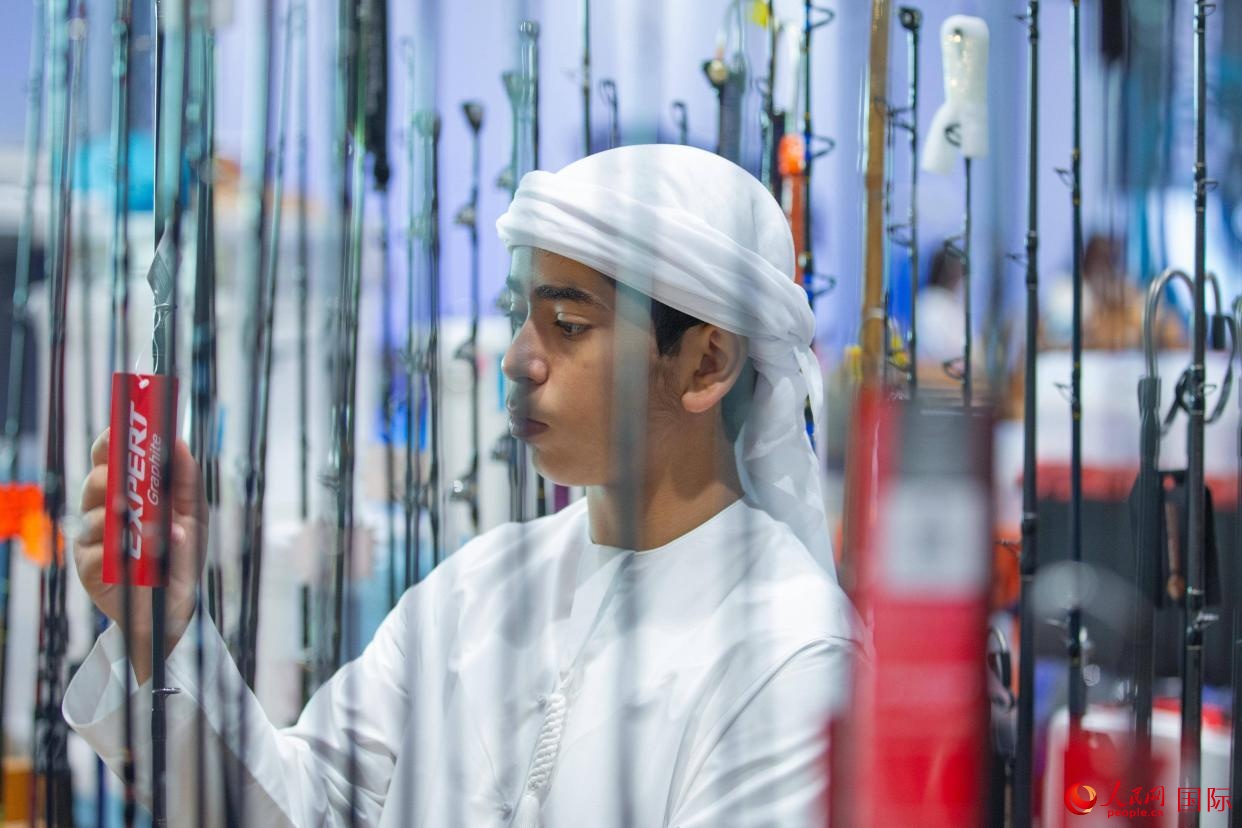 一位小觀眾在了解釣魚(yú)裝備。人民網(wǎng) 塔里克·易卜拉欣攝