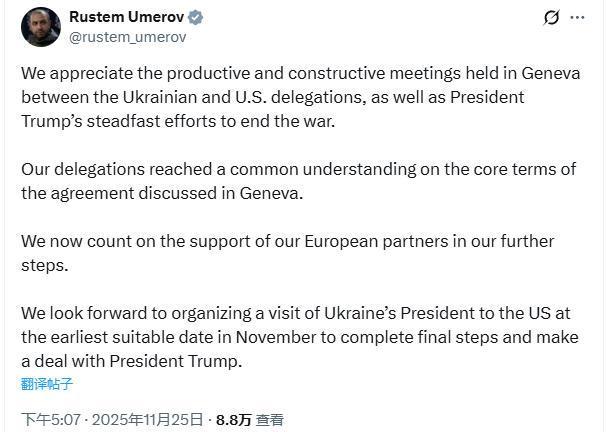 烏克蘭國(guó)家安全與國(guó)防委員會(huì)秘書烏梅羅夫則于同日在社交媒體上公開表態(tài)稱,美烏雙方代表團(tuán)已就在日內(nèi)瓦討論的協(xié)議的核心內(nèi)容上,達(dá)成一致。