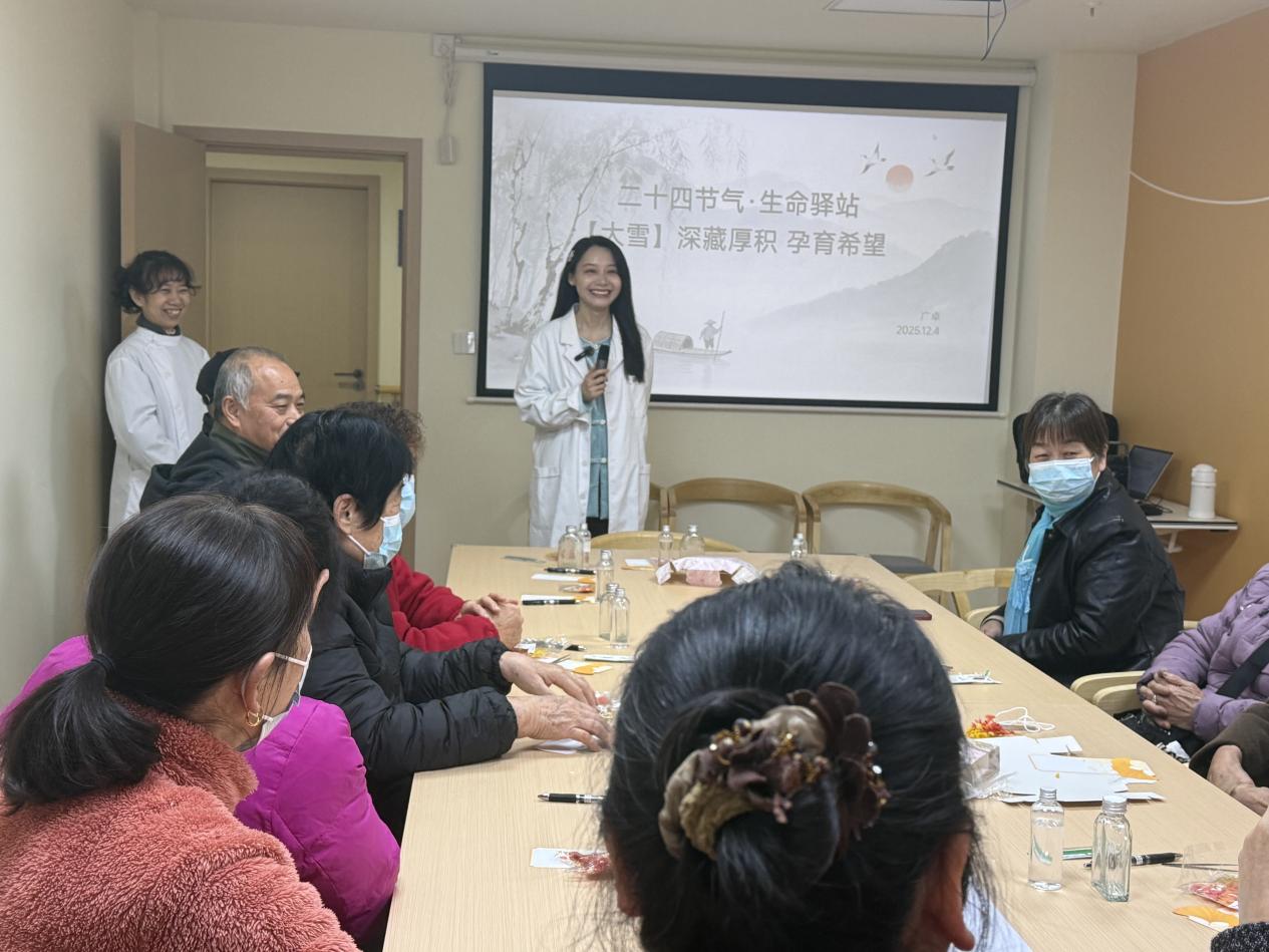 12月4日下午,武漢市洪山區(qū)梨園街道綜合養(yǎng)老服務中心內(nèi)暖意融融、靜穆有序,“大雪?深藏厚積,孕育希望”二十四節(jié)氣心理團輔活動在此溫情開展。本次活動由武漢大學中南醫(yī)院血液內(nèi)科聯(lián)合東湖社區(qū)衛(wèi)生服務站、梨園街道綜合養(yǎng)老服務中心、家庭健康服務中心共同舉辦,并獲韓紅基金會贊助。以“大雪”節(jié)氣為文化紐帶,深度融合傳統(tǒng)智慧與現(xiàn)代心理關(guān)懷,旨在為轄區(qū)老年人提供一場溫暖而深入的心理團輔。