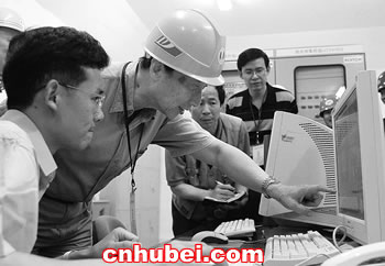 三峽總公司總經(jīng)理陸佑楣在泄水閘集控室現(xiàn)場(chǎng)了解泄洪閘監(jiān)控情況。