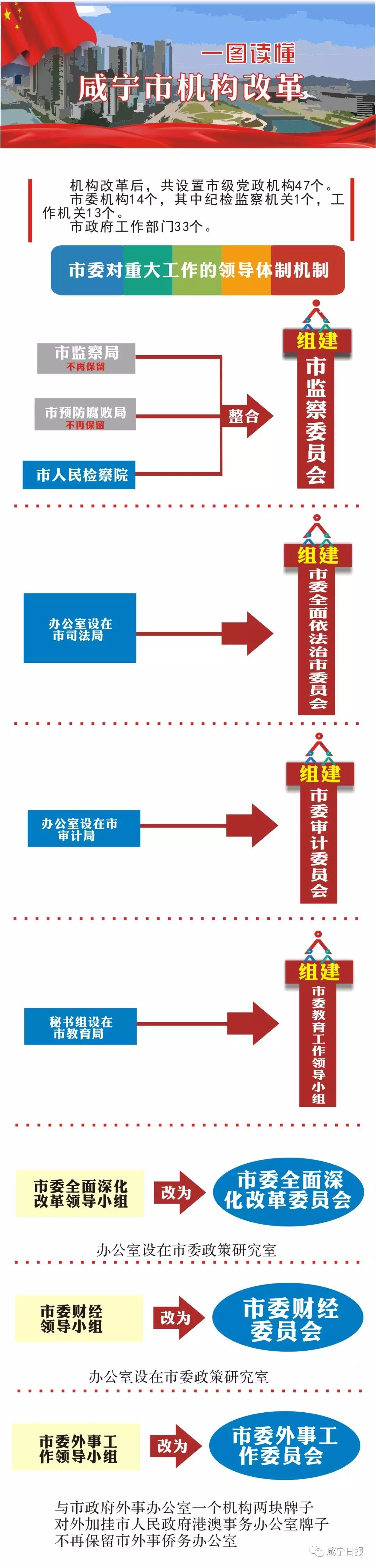 我市召開機(jī)構(gòu)改革動員大會,標(biāo)志著我市機(jī)構(gòu)改革全面啟動。根據(jù)省委省政府批準(zhǔn)的《咸寧市機(jī)構(gòu)改革方案》,本輪機(jī)構(gòu)改革后,市本級共設(shè)置黨政機(jī)構(gòu)47個。市委機(jī)構(gòu)14個,市政府工作部門33個。改革方案還對黨政直屬事業(yè)單位實施了限額管理,并進(jìn)一步規(guī)范了黨政派出機(jī)構(gòu)置。