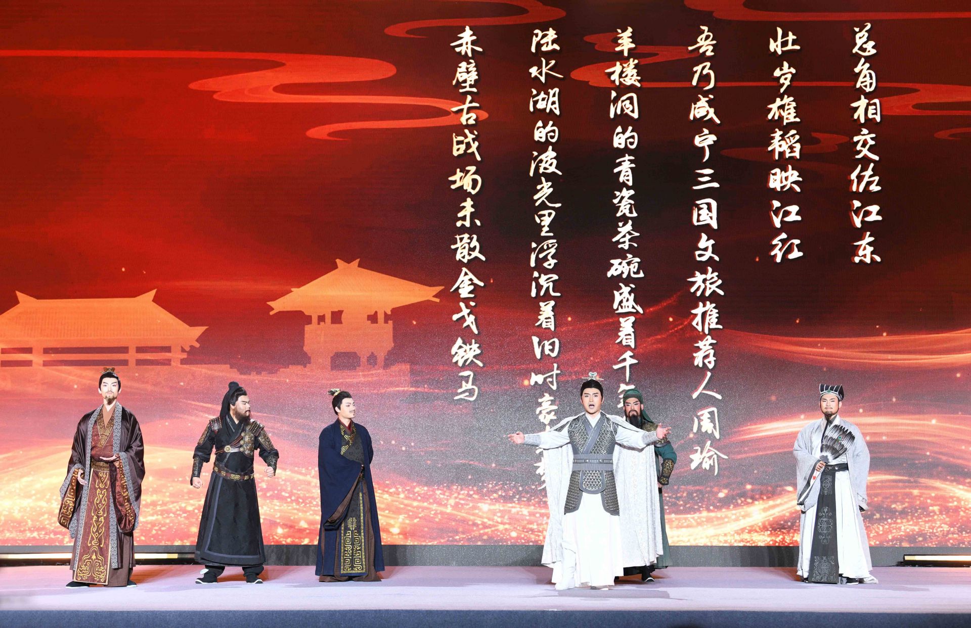 “三國(guó)六城,今日結(jié)盟!與君共同開(kāi)啟,荊楚三國(guó)文化之旅?!眴?dòng)式上,身著古裝的文旅推薦官,化身三國(guó)英雄劉備、關(guān)羽、張飛、諸葛亮、孫權(quán)、周瑜等,穿越歷史時(shí)空,分別代表武漢、荊州、宜昌、襄陽(yáng)、鄂州、咸寧對(duì)外推介各地三國(guó)旅游景點(diǎn)和線路。