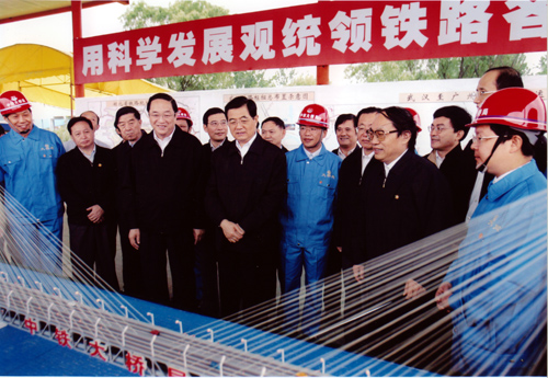 2005年8月22日上午,中共中央總書記、國家主席、中央軍委主席胡錦濤同隨行的中共中央政治局候補(bǔ)委員、中央書記處書記、中央辦公廳主任王剛,在中共中央政治局委員、湖北省委書記俞正聲,湖北省省長羅清泉等陪同下,考察了正在建設(shè)中的武漢天興洲公鐵兩用長江大橋工程,對鐵路建設(shè)作出重要指示。胡總書記指出,武廣鐵路客運(yùn)專線和武漢天興洲大橋是中國鐵路建設(shè)史上新的里程碑。這條鐵路線的建設(shè)標(biāo)志著中國鐵路客運(yùn)專線建設(shè)的開始,今后要建設(shè)更多的鐵路客運(yùn)專線。一定要把武廣客運(yùn)專線和天興洲大橋這個我國鐵路建設(shè)史上新的里程碑工程建設(shè)好。