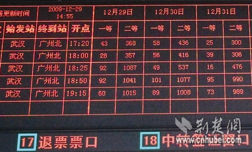 12月29日下午2時55分前后,記者在武漢站售票大廳看到,每10分鐘刷新一次的售票余額大屏幕顯示,停靠在站臺上即將于15時30分發(fā)車的G1045次列車,一等票剩111張、二等票剩716張,按照雙聯(lián)8節(jié)車廂、1200個座位計算,銷售車票350張左右,上座率三成左右。