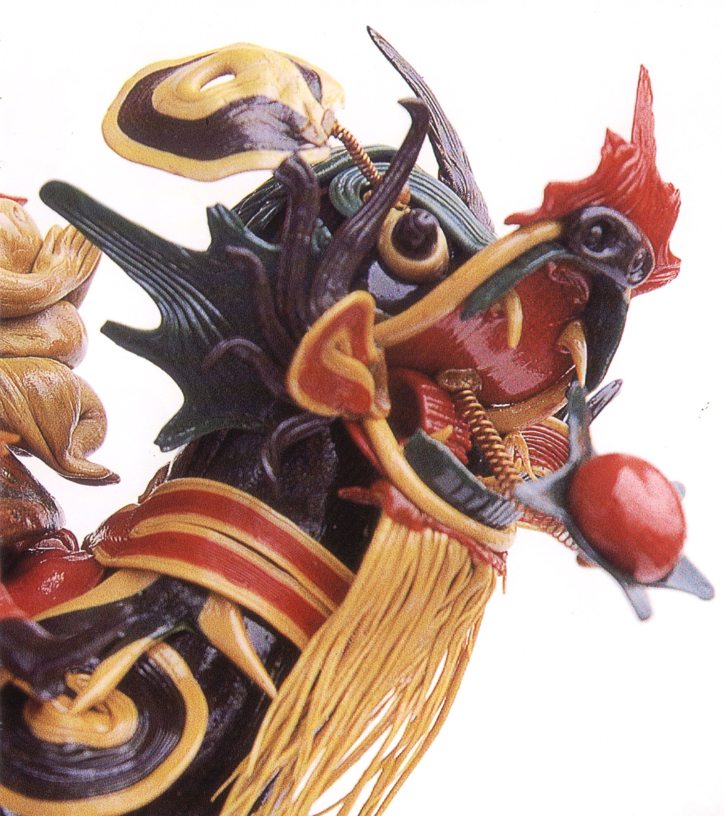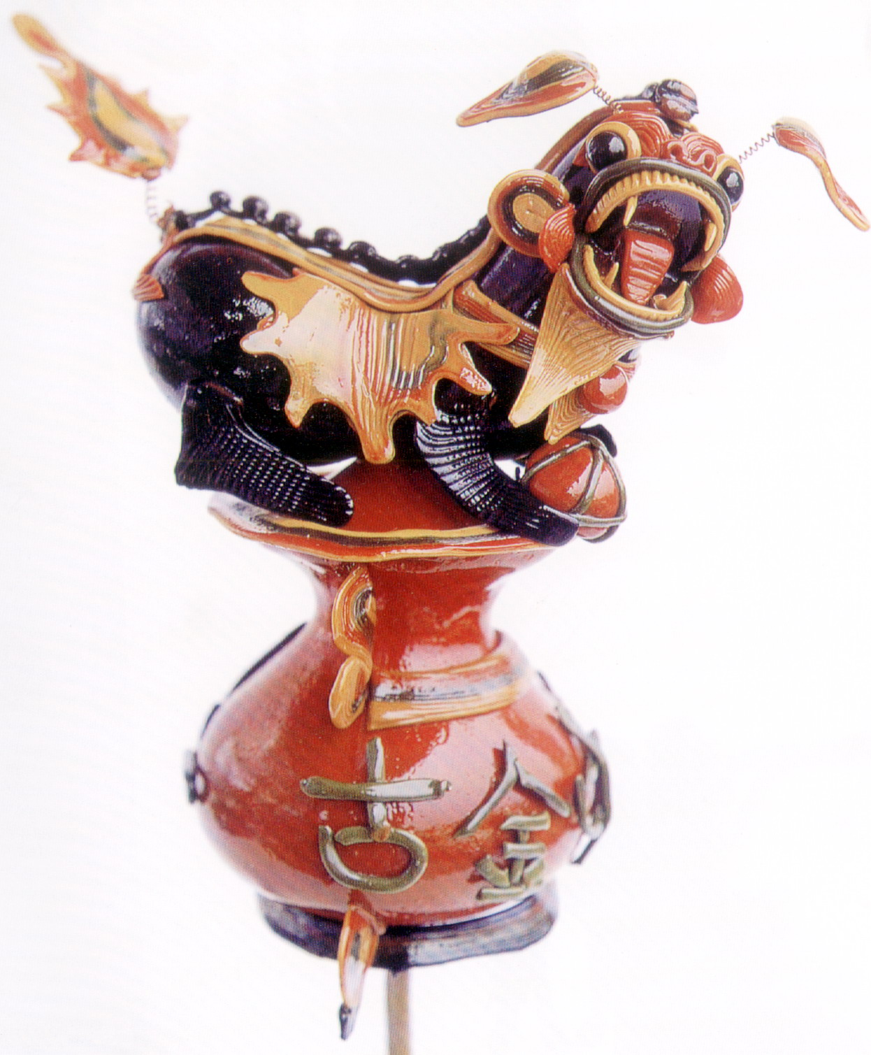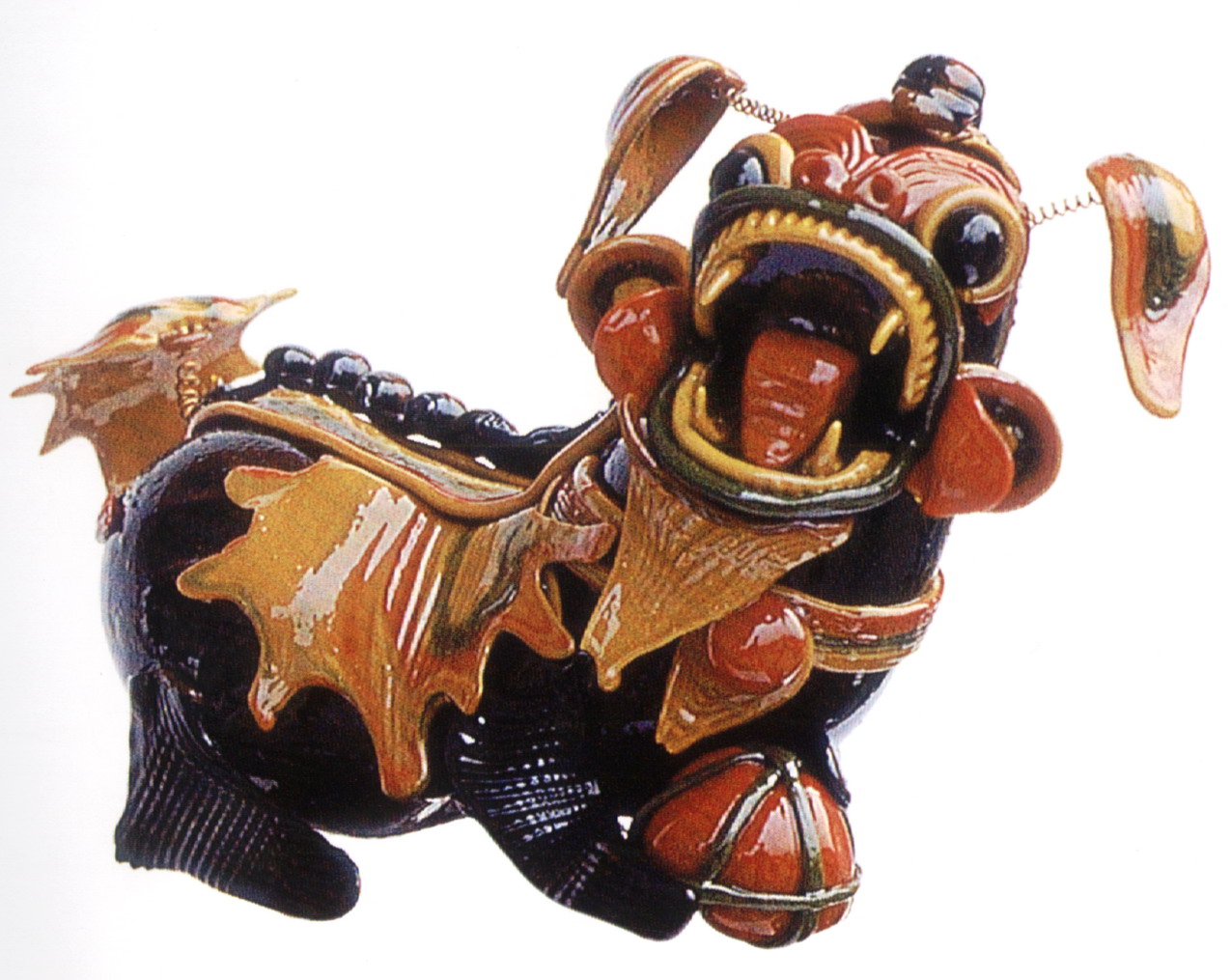 糖塑,俗稱吹糖,在湖北遍及全省,尤以天門最為突出。糖塑之所以贏得人們的喜愛,是因為它獨具特色:1、原料可塑性強:麥芽糖是糖塑的主要原料,加熱后變軟,比面塑更具可塑性,既可吹成薄而亮的各類造型,又可拉成粗細不同的糖絲。捏成不同形狀的配件,易粘且牢固;2、造型神形兼?zhèn)洌禾撬艿募妓囍饕Ψ蛟凇按怠鄙希粔K糖坯在藝人手中,邊吹邊捏,再通過搓、壓、挑、剪等手段,加上輔助的小鐵絲,少則幾分鐘,多則半小時,一件作品就完成了;3、色彩和諧醒目:麥芽糖加溫變軟加入紅、綠、黃、黑四種色素,根據(jù)需要又可調(diào)和成數(shù)十種復色,色彩響亮和諧;4、肌理變化豐富是糖塑獨具的特點:在糖塑中,附件變化萬千的肌理又與主體吹成光滑的表面形成鮮明的對比,顯得更加豐富耐看;5、“活”的部件是糖塑的又一特點:有的部件裝上自制的鋼絲彈簧,一經(jīng)拿在手中,部件都“活”起來了,更具生氣。